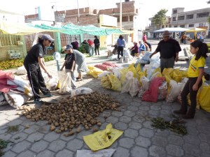 Than finally the actual day of the Canasta has awaken and early in the morning (around 6.00am) volunteers mainly from ‘El Grupo Cero’ gather to help organize a beautiful ‘Canasta Comunitaria’. (El Grupo Cero exists of six to eight members of the Canasta Comunitaria and organizes themes such as, the logistics, evaluation etc.) The products bought at the Mercado Mayorista and the products from the small local producers need to be divided equally in ‘los Canastas’ so all consumers share the same volume for the same price. Utopia takes the lead and manages everyone to get ready in time for the consumers who subscribed for the Canasta. On the photos below you can see the end product of such an important initiative as a Canasta Comunitaria.
