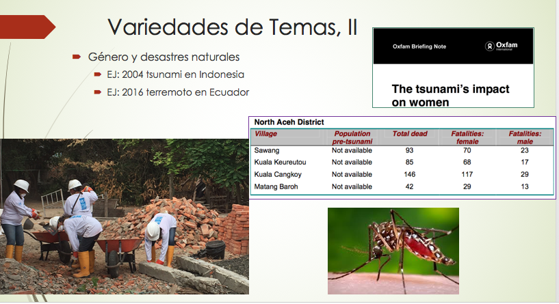 Ginette presented three topics demonstrating the intersection of gender and environment, and the importance of doing gender analyses when looking at environmental and energy issues. One example was the gender and national disasters (which are being exacerbated by climate change) and the 2004 Indonesian tsunami. Some villages saw fatality rates of 69 – 80% for women. Many of the reasons for this high, gendered death toll is that many of the women were at home, many caring for children or elderly. Men, who were not at home and were not responsible for others during the time the tsunami hit, did not have such high death rates. Another example discussed was the 2016 earthquake in Ecuador, and the different needs based on gender post-disaster. Pregnant women were at risk of Zika, national disasters also increase rates of sexual and gender-based violence, and gender roles were challenged during rebuilding and reconstruction. An additional topic was land tenure; in 59% of countries, there are laws that guarantee women the same rights as men to own, use, and control the land, but they are not implemented. Traditional practices, customs, or religion determine this, and these discriminate against women from having these rights to land.